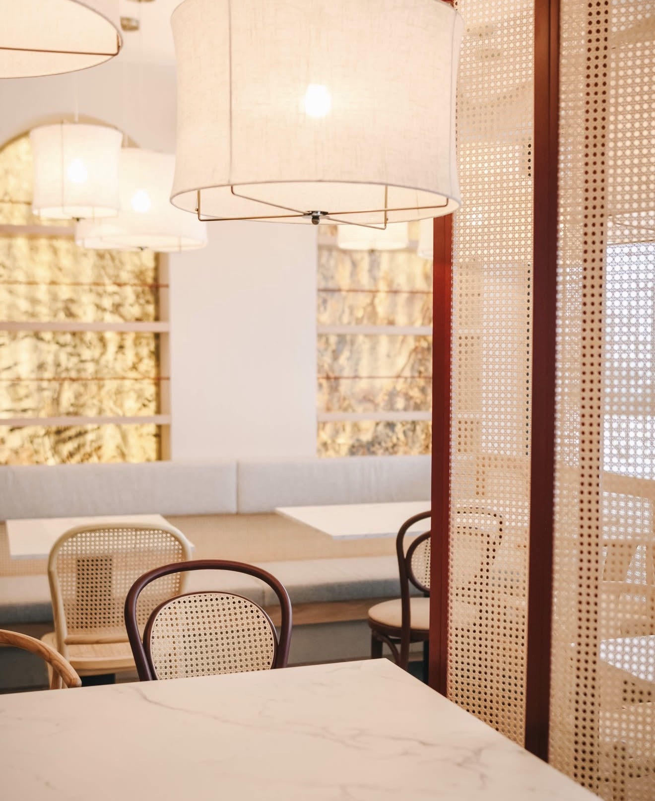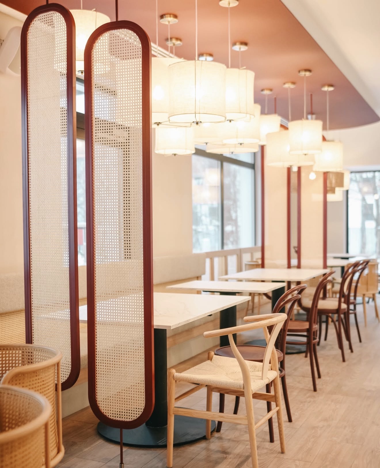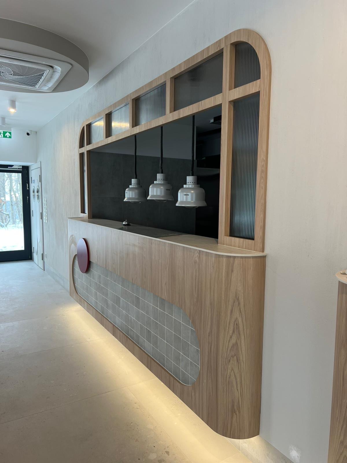 Zakres: zabudowa barowa, zabudowa wydawki, stoliki, zabudowy z siedziskami, podświetlane wnęki na wina z półkami, pomocnik kelnerski, szafka z ekspozycją kawy, przegrodowe panele rattanowe, zabudowa łazienek, drzwi wahadłowe