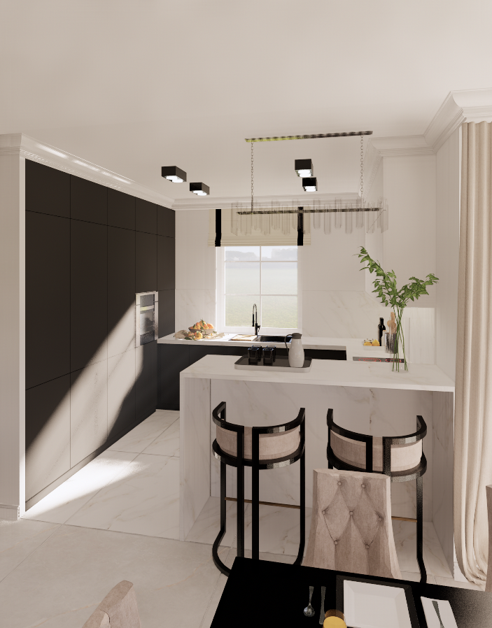 To willowa przestrzeń, w której nowoczesność spotyka się z elegancją, a każdy detal ma swoje miejsce i znaczenie. Jasne tony ścian subtelnie kontrastują z głębią czerni, tworząc harmonijną grę światła i cienia. Króluje tu spokój, proporcja i ponadczasowy styl. Obecnie projekt jest w trakcie realizacji stolarskiej, planowany termin ukończenia to I kwartał 2026.